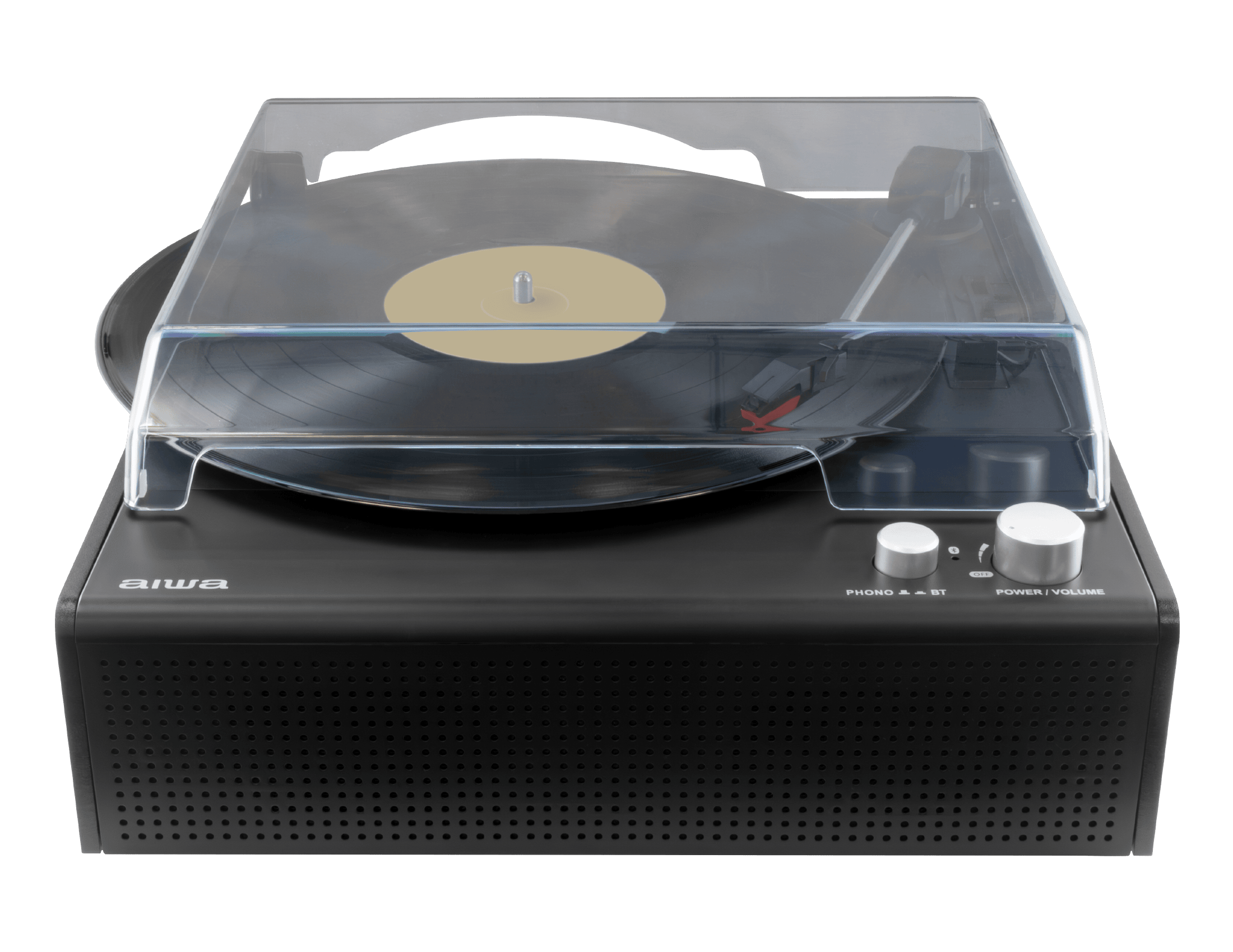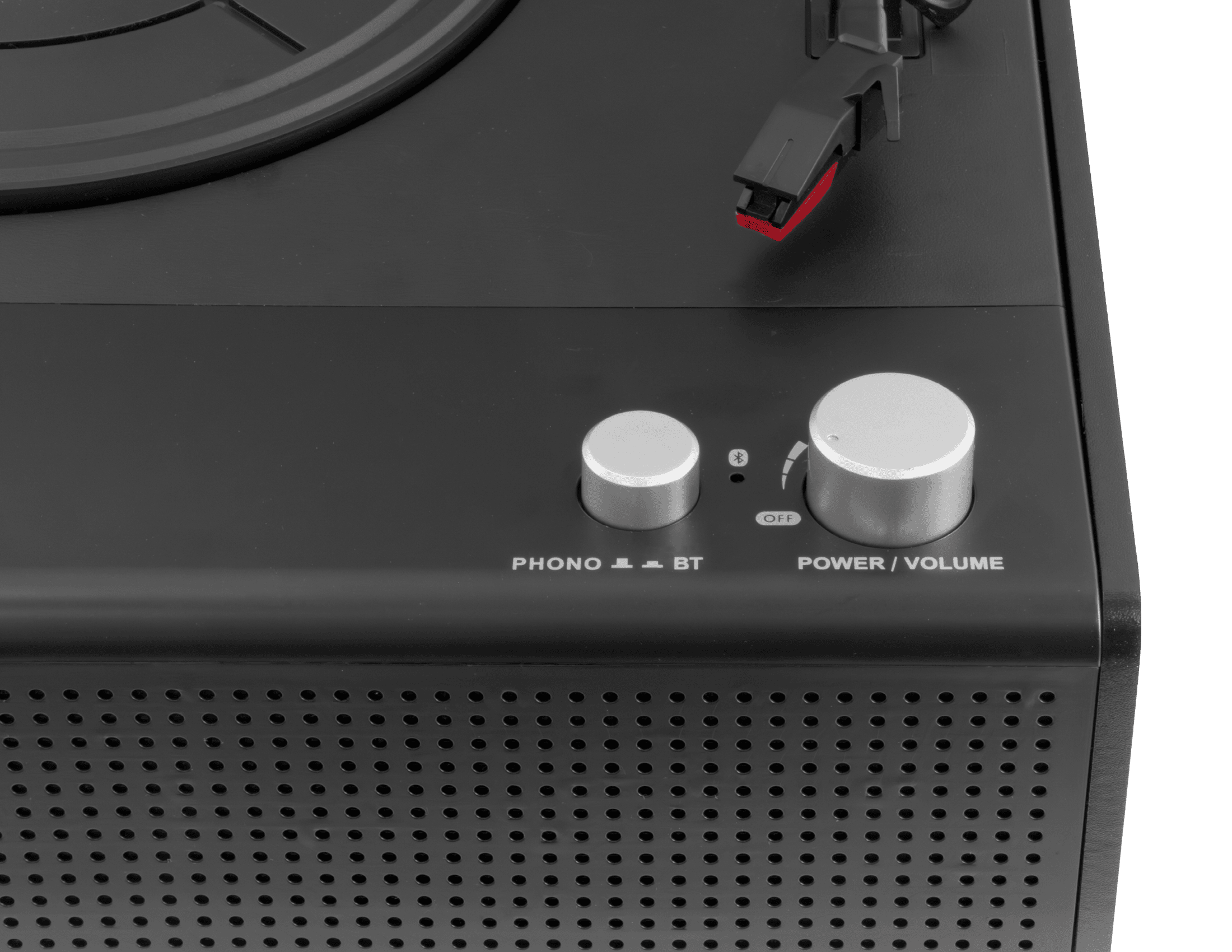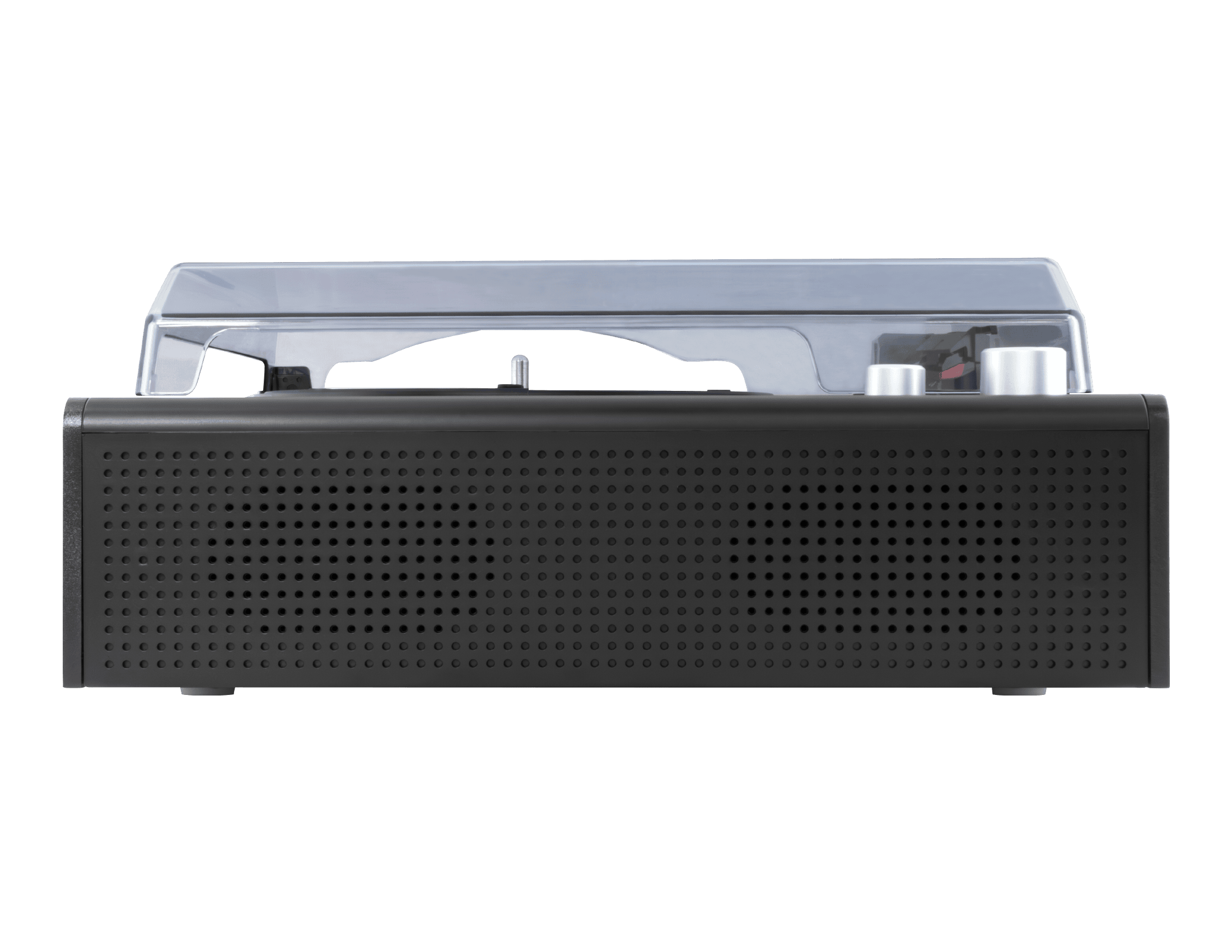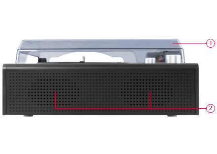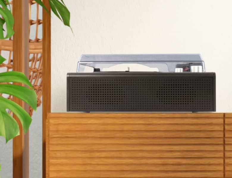 本体前面に2つのスピーカーを内蔵。これ一台だけですぐにレコード音源が楽しめます。