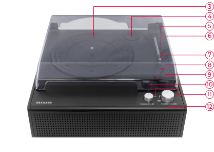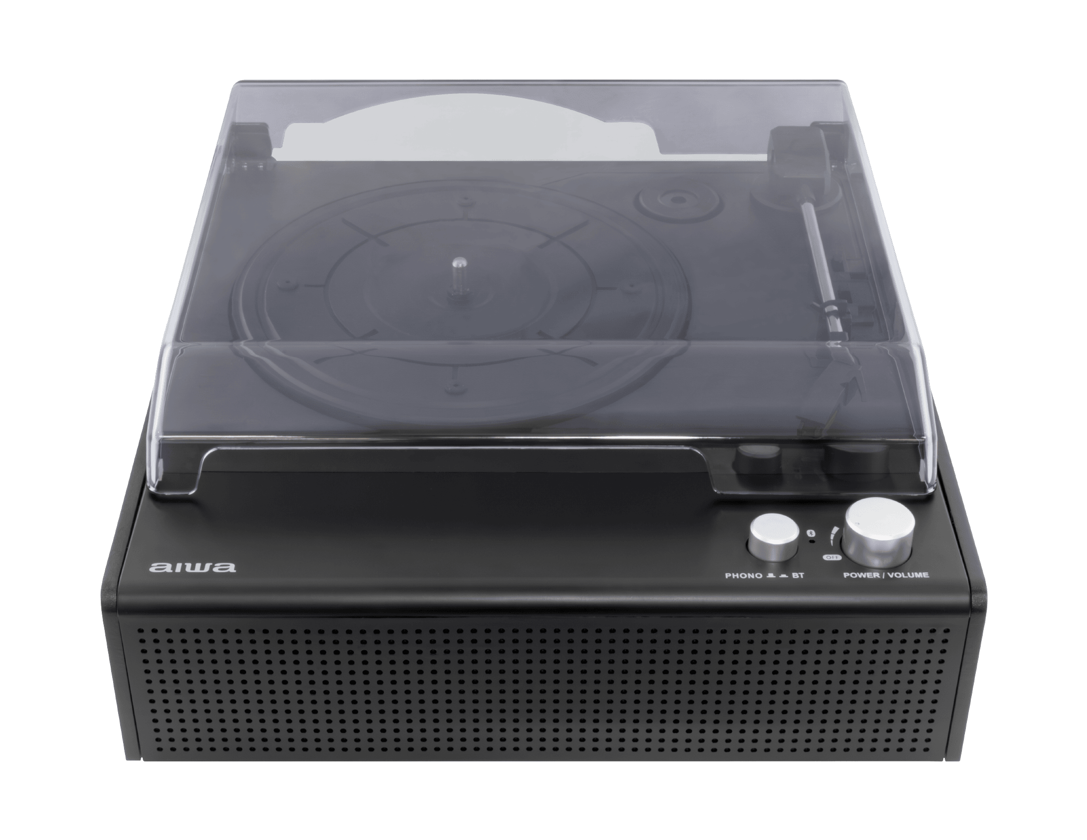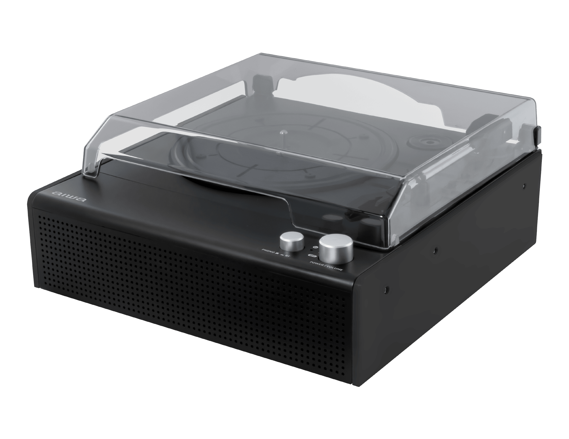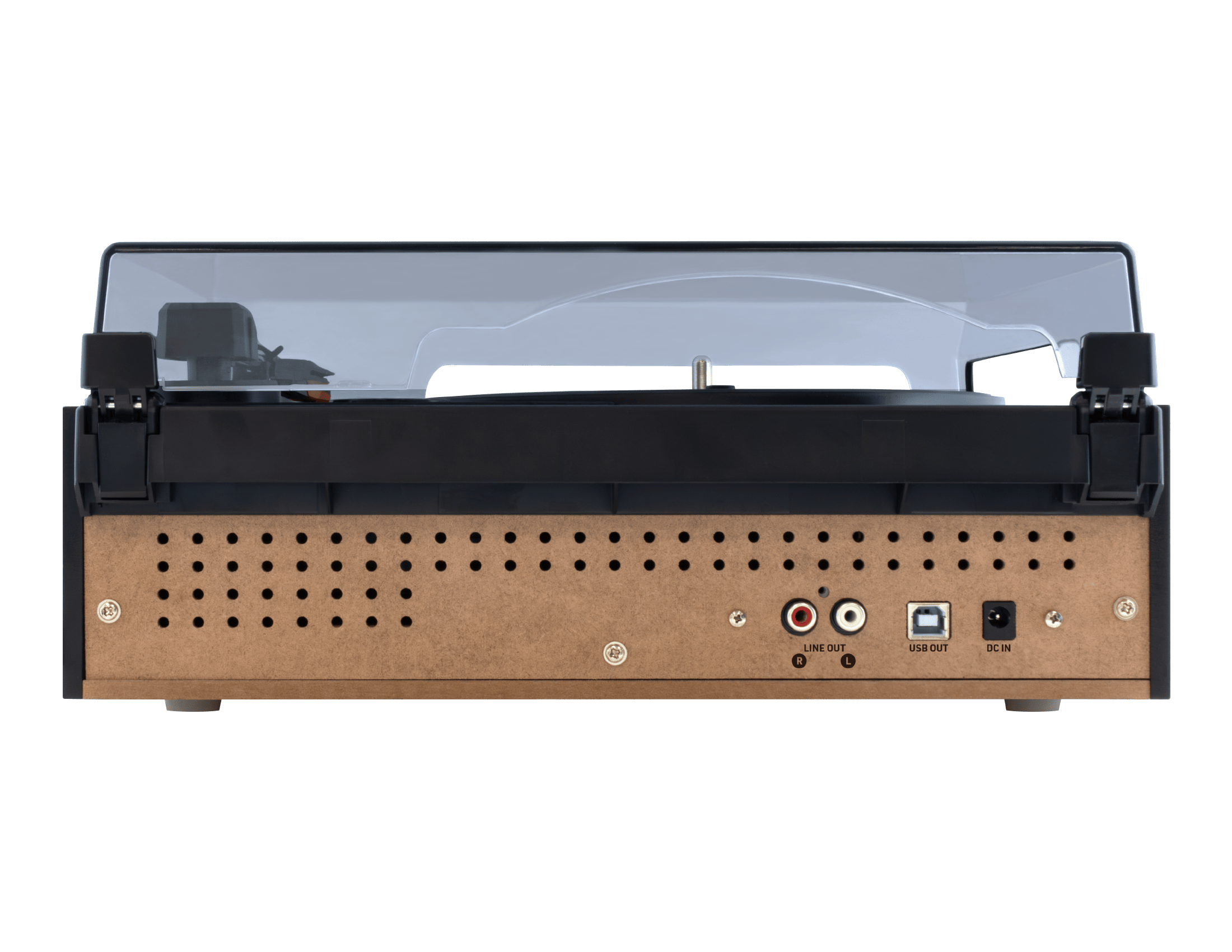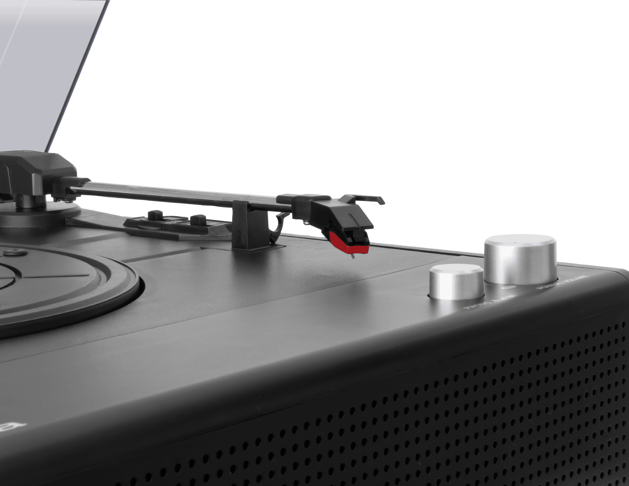 本体前面に2つのスピーカーを内蔵。これ一台だけですぐにレコード音源が楽しめます。