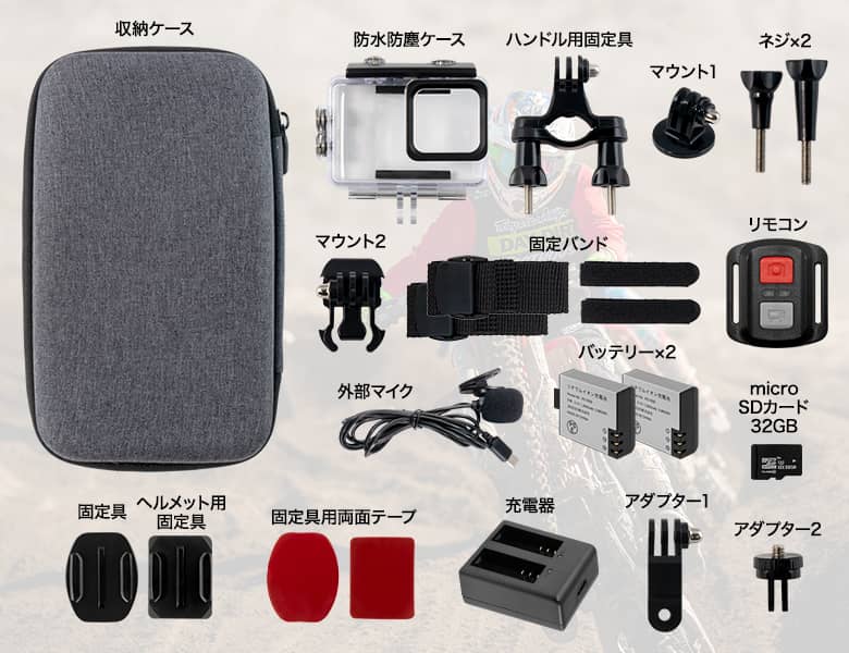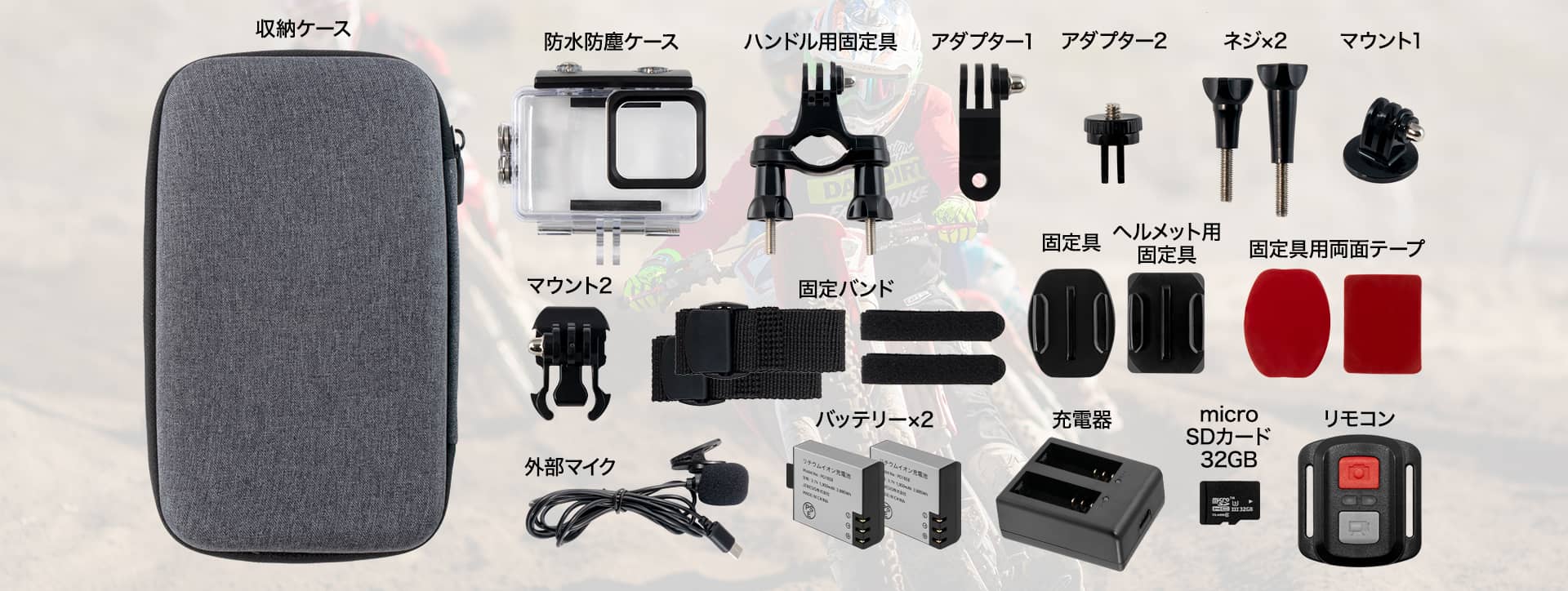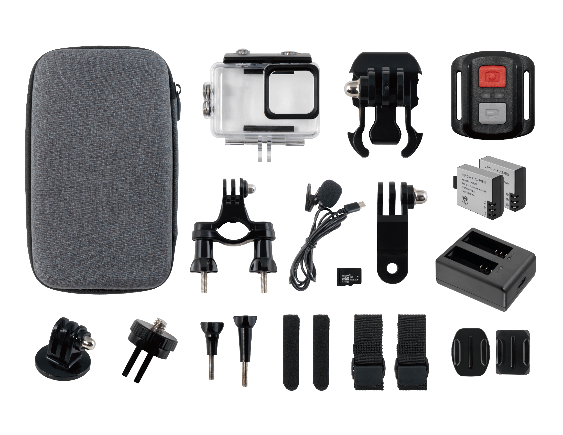 アクションカメラを購入した多くの人が別途購入する予備のバッテリーや充電器、SDカードも付属。購入してすぐに撮影が始められます。