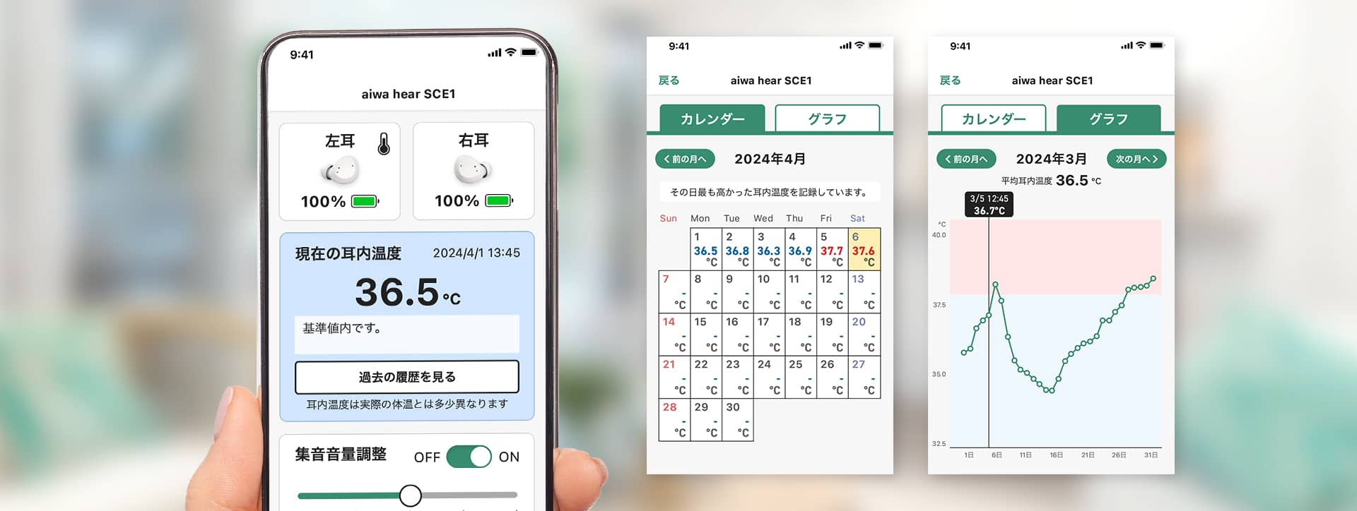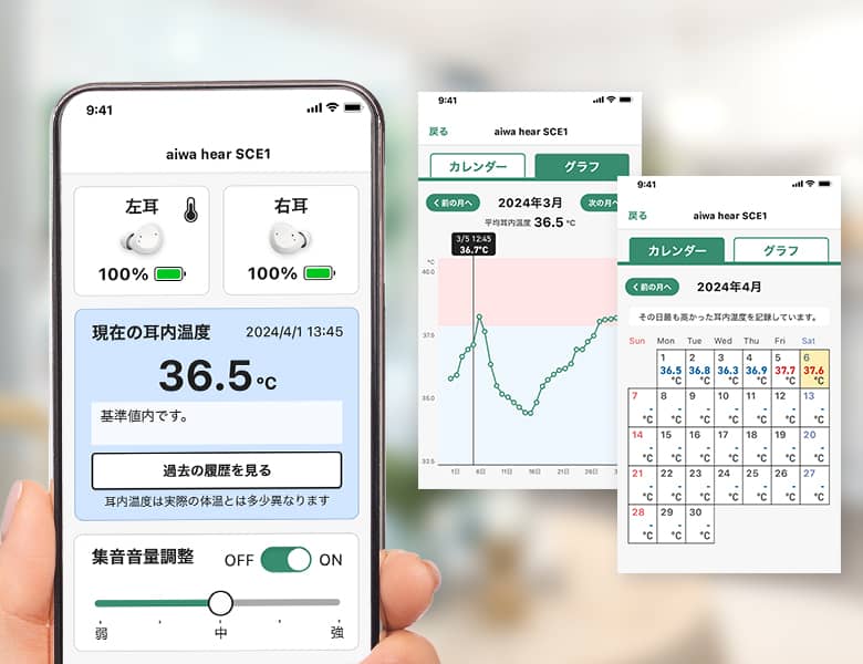 専用のアプリで現在の耳内温度とメッセージを表示するだけでなく、過去の履歴もカレンダーやグラフで確認できるので、ご自身の体調を見える化することが出来ます。