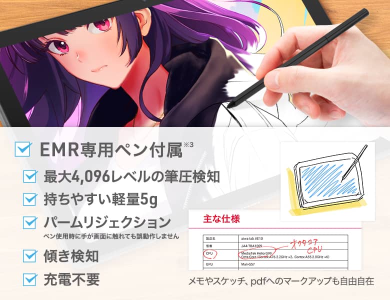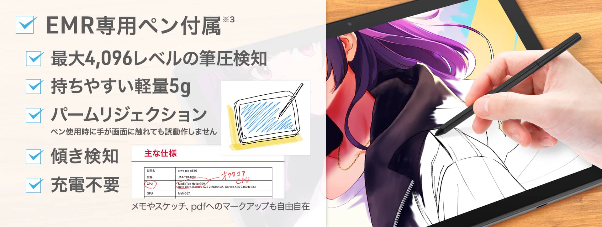 筆圧感知や傾き検知はもちろん、パームリジェクション機能も完備しており、デザイン、メモ、イラスト、文書作成まで、用途に合わせて最適なペンを自由に選択可能。従来の制約をなくし、どんなスタイルにも対応する新たな使い心地を実現しました。また、本体には充電不要の専用EMRペンが付属。