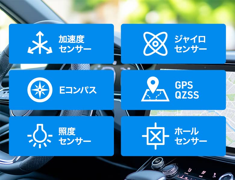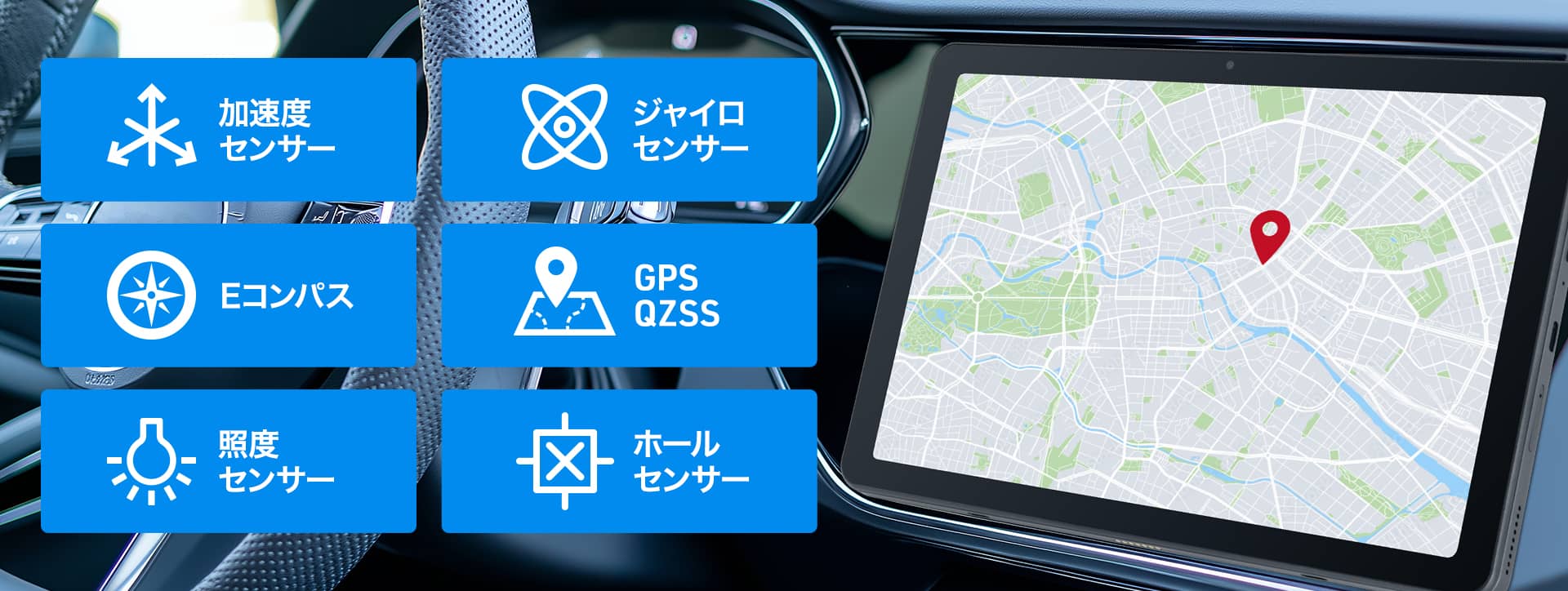 加速度センサーをはじめ、ジャイロセンサー、Eコンパスなど充実のセンサー類を備えています。傾きや回転で操作するゲーム、テザリングでのカーナビ用途など幅広い場面で活躍します。