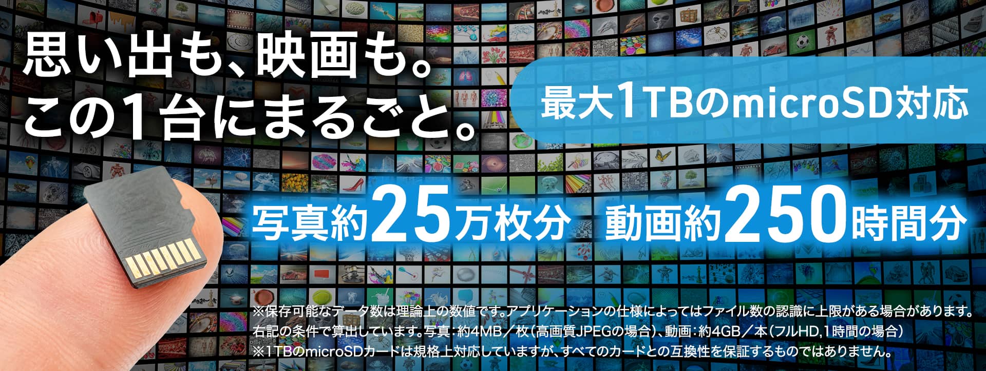 さらに、microSDカード(別売)を活用すれば最大1TBまでストレージを拡張可能で容量不足には悩みません。