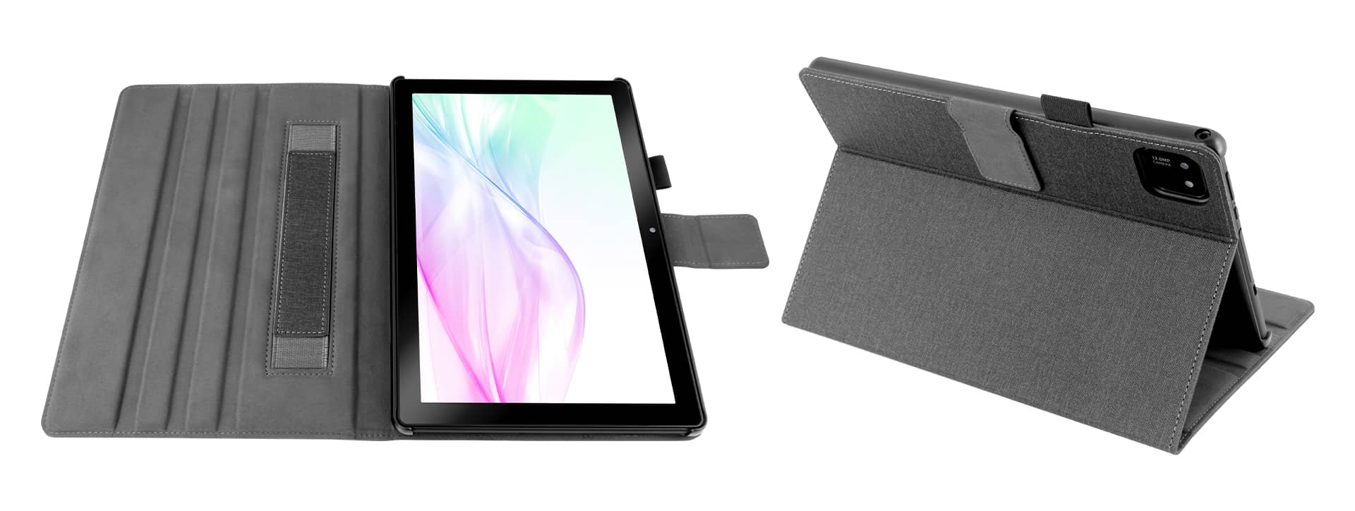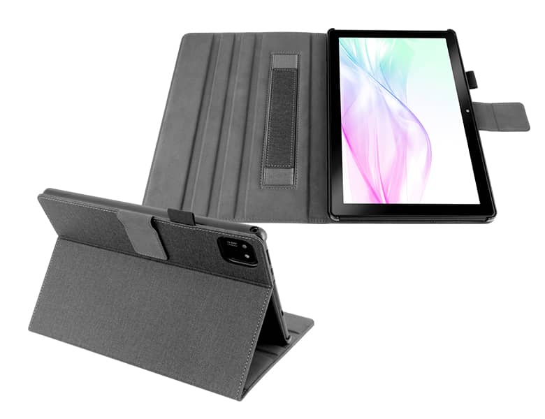 ファブリック素材のスタイリッシュな専用ケース。傾きを3段階調節できるスタンドとしても使用できます。また、ハンドホルダーに手を通してしっかりと手に持って使用できます。ペンホルダーにタッチペン等を収納して持ち運びもできます。